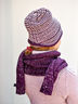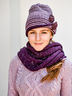 Комплект аксессуаров для холодных сезонов: шапка и шарф, выполненные в стильном дизайне. Шапка с отворотом, изготовлена из фиолетовых и сиреневых нитей, сбоку декорирована кожаными цветочками. Шарф фиолетового цвета, однотипная вязка. В каждом из предметов присутствует вплетенная контрастная нить, что придает изделию уникальный вид.