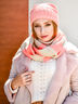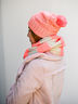Комплект состоящий из шапки и шарфа, такой теплый набор согреет Вас холодной зимой и создаст стильный и яркий образ. Шапка с помпоном и отворотом, шарф выполненный узорной вязкой, оба предметы выполнены в двухцветном дизайне: белый и коралловый.