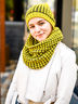 Зимний комплект: шапка и шарф-снуд. Шапка с помпоном, небольшая резинка, узорная вязка, шарф выполнен той же вязкой. Объемная нить создает интересный дизайн этого комплекта, а сочетание двух контрастных оттенков делает его еще более стильным и интересным.