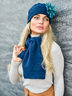 Стильный женский комплект синего цвета, мягкая текстура и аккуратный дизайн, несомненно, Вам понравятся. Шапка с резинкой, дополнена объемным цветком, выполненных в двух оттенках, изделие плотно обтягивает голову, надежно защищая уши от ветра. Шарф простейшего дизайна, без лишних деталей, но это не мешает ему быть на высоте, шарф окутает Вашу шею теплотой и уютом.