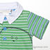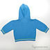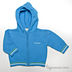 В комплект входят футболка, джинсовые брюки и кофта. Рукава и спинка футболки в трехцветную полоску. Внешняя сторона футболки в белую полоску и с принтом. Воротник белый. Футболка застегивается на три голубые пуговицы. Брюки с двумя карманами впереди. Сзади накладной карман. Швы отстрочены белой и салатовой нитками. Пояс резинка. Застежек нет. Кофта на молнии с капюшоном. Манжеты рукавов и низ кофты на резинке.