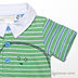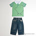 В комплект входят футболка и джинсовые брюки. Рукава и спинка футболки в трехцветную полоску. Внешняя сторона футболки в белую полоску и с принтом. Воротник белый. Футболка застегивается на три голубые пуговицы. Брюки с двумя карманами впереди. Сзади накладной карман. Швы отстрочены белой и салатовой нитками. Пояс резинка. Застежек нет.