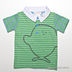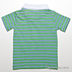 В комплект входят футболка и джинсовые брюки. Рукава и спинка футболки в трехцветную полоску. Внешняя сторона футболки в белую полоску и с принтом. Воротник белый. Футболка застегивается на три голубые пуговицы. Брюки с двумя карманами впереди. Сзади накладной карман. Швы отстрочены белой и салатовой нитками. Пояс резинка. Застежек нет.