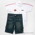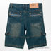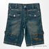 Модель бермуд свободного кроя застегивается на пуговицу и молнию. Пришиты петли для ремня. Два перердних кармана на молнии, два передних кармана на пуговицах, два задних кармана на молниях. Декоративные элементы: вышивка на левой брючине, боковые хлястики на брючинах снизу.