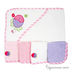В комплект входят: большое полотенце с капюшоном и четыре салфетки для купания из махры. Полотенце и салфетки украшены вышивкой- аппликацией в виде рыбки и отделаны розовой тесьмой.
