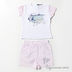 Футболка из тонкого трикотажного хлопка выполнена из белой ткани с декоративным принтом и стразиками. Расцветка рукавчиков сочетается с расцветкой шортиков. На спинке застежка на пуговки.