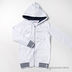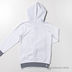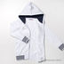 Стильная толстовка белого цвета стягивается кулиской в области талии. Оригинальные манжеты на рукавах и по нижнему краю изделия выполнены с контрастными черными полосками. Капюшон с внутренней части имеет подкладку из черной ткани в мелкий горошек. На полочке декоративный принт.