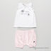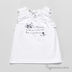 Слегка расклешенная майка на лямках застегивается на одну пуговицу на спинке. Проймы и вырез горловины посажены на резинку. Полочка украшена аппликацией и бантиками.