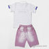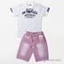 Футболочка дополнена воротничком. Принт на полочке. Брючки из тонкой джинсовой ткани имеют эффект потертости. Пояс на резинке, дополнен шнуровкой.