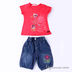 Футболка с аппликацией "Цветы" и короткими рукавами, украшенными рюшками. Джинсовый бриджи с большими кармашками и вышивкой.