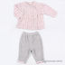 Расклешенная кофта на кнопках, украшенная рюшками и вышивкой, и штаны на резинке, украшенные по низу рюшками.