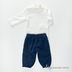 Выполнены из вельвета синего цвета, с подкладом из тонкого неокрашенного хлопка. В пояс вставлена резинка, застегивается на кнопку. По низу брюк манжетки собранные на резиночку. Спереди два накладных кармана.