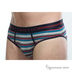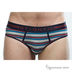 Трусы слипы из слегка эластичной хлопковой ткани классического кроя. Сверху посажены на широкую резинку. Декорированы оригинальным принтом-полоска и контрастными вставками.