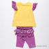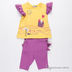 Детали: футболка - круглый вырез; рукав в виде двухслойных оборок; на полочке аппликация; застегивается на плече на кнопки; шорты - посажены на резинку; декорированы оригинальными оборками