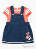 Комплект состоит из футболки и джинсового сарафана. Футболка с округлым вырезом и коротким рукавом-фонариком. Декорирована контрастной тесьмой. Сарафан - пояс со шлевками на резинке, бретели на пуговицах. Декорирован принтом.