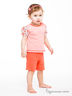 Комплект состоит из футболки и шорт. Выполнен из хлопчатобумажной ткани. Футболка с округлым вырезом горловины и коротким рукавом дополнена застежкой на кнопки на плече. Декорирована рисунком на рукавах. Шорты на резинке.