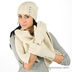 В комплект входит: стильная шапка, перчатки и теплый, мягкий шарф. Комплект декорирован стразами.