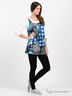 Эффектный домашний костюм, состоящий из туники и леггинсов, выполнен из мягкого хлопкового трикотажа. Туника свободного покроя. Широкий округлый вырез горловины. Облегающие рукава 3/4. Спереди под кокеткой полочка собрана складками. Два накладных кармана. Рукава и ворот выполнены из однотонного трикотажа. Леггинсы выполнены из мягкого, эластичного трикотажа. Модель облегающего покроя. Неотрезной пояс на резинке.
