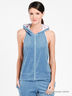 Жилет прямого силуэта с капюшоном застегивается на полочке на молнию. Низ изделия посажен на манжету. Открытая спинка.