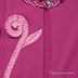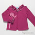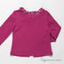Кофта прямого кроя с длинным рукавом застегивается на одну пуговицу. Вырез горловины и манжеты украшены рюшей. Полочка декорирована рюшей и нашивкой.