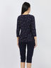 Комфортный комплект для сна и отдыха, состоящий из футболки и бриджей. Футболка полуприлегающего силуэта с рукавом-реглан 3/4 выполнена из принтованного полотна. Бриджи прямого фасона, слегка заужены к низу из однотонного полотна.