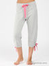 Бриджи прямого силуэта. В пояс и низ брючин вставлены регулирующие ленты, завязывающиеся в бантики.