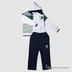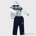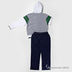 Комплект состоит из брюк и толстовки. Брюки украшены принтом и нашивкой. Разноцветная толстовка украшена декоративной вышивкой и нашивкой.