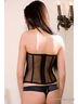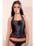 Корсет из мягкого однотонного сатина. Спереди и сзади имеются вертикальные рельефы. Спереди по низу наклонные вставки со складками плиссе. Спереди вырез горловины «каре» и с широкими бретелями, застёгивающимися на шее. Сзади эффектная корсетная шнуровка на шёлковой ленте.