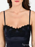 Детали: тонкие, регулируемые по длине бретели, формованный лиф с плотными чашечками декорирован кружевом, низ изделия декорирован стразами.