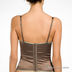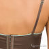 Корсет на косточках из атласного материала. Чашечки с эффектом push-up на гелевом уплотнителе. Вертикальные швы. Регулируемые бретельки. Застегивается сзади на крючки. Украшен серебристым кантом, контрастной прострочкой и бантиком спереди.