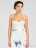 Стильный и сексуальный корсет из легкого материала. Тонкие регулируемые бретельки. Отрезной лиф с уплотнителем и диагональными швами. Корсет застегивается сзади на золотистую молнию. Декорирован крупным золотым украшением на атласных лентах.
