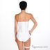Корсет на каркасе без бретелек. Выполнен из нежной эластичной ткани. Лиф декорирован богатой ажурной вышивкой. Застегивается на три ряда крючков.