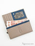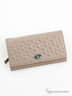 Изящный женский кошелек выполнен из натуральной кожи. С внешней стороны кошелек декорирован фактурным теснением и металлической вставкой. Основное отделение застегивается на кнопку. Внутри отделения для купюр, кредитных карточек и монет.