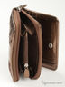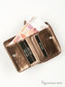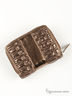 Кошелек закрывается на кнопку. Внутри два отдела под купюры, восемь отделений под визитки. Отдельный карман на молнии для мелочи. Размер: 12,5х3,5х10 см.
