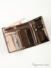 Кошелек закрывается на кнопку. Внутри два отдела под купюры, восемь отделений под визитки, карман на кнопке для мелочи. Размер: 15х3,5х10 см.