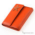 Женский кошелёк Eleganzza оранжевого цвета из натуральной кожи. Модель закрывается клапаном с кнопкой. Отделение для мелочи находится внутри, имеет 2 отделения и закрывается на клапан с кнопкой. В кошельке есть 2 складывающихся отделения для крупных купюр и 3 отделения для кредитных и дисконтных карт.