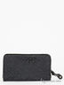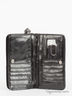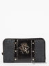 Кошелек выполненный из ткани и иск. лакированной кожи. Металлическая эмблема и заклепки для украшения на лицевой стороне. Раскладывается в два раза. Есть отделение для мелочи, закрывающееся на молнию Внутри одно большое отделение, и с двух сторон множество отделений для карт.