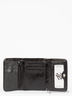 Небольшой кошелек выполненный из ткани и иск. лакированной кожи. Металлическая эмблема и заклепки для украшения. Раскладывается в три раза. Внутри одно большое отделение, отделения для карт, фото и небольшое отделение на молнии для мелочи.