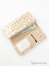 Кошелек застегивается на кнопку. Внутри четыре больших отделений, одно из которых на молнии. Под крышкой кошелька отделения для четырех визитных карточек, под ними одно большое отделения. Снаружи сзади отделение на молнии. 19х2х9 см