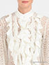 Детали: блуза - втачной воротник стойка, застежка на кнопках, декор в виде многоярусной рюши, выполнена из вышитой ткани с узором цветов, длинные свободные рукава с широкой манжетой; стильная юбка - выполнена в строгом стиле, застежка на молнии по шву изделия.