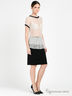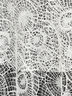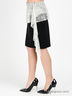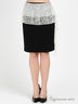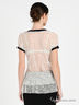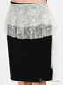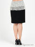 Костюм состоит из блузона и юбки. Юбка прямого кроя выполнена из плотного трикотажа средней эластичности. Застегивается на молнию сбоку, декорирована ажурными оборками. Блузон выполнен из тонкой ткани ажурной вязки, окантовка круглого выреза и манжеты короткого цельнокроеного рукава контрастного цвета.