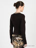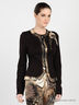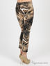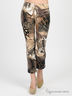Костюм состоит из капрей и кардигана. Капри с отрезным поясом и застежкой на молнию и крючок декорированы рисунком. Кардиган на молнии, декорирован контрастной окантовкой и тканевым цветком на полочке.