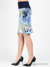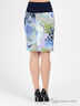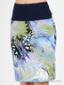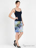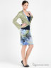 Костюм состоит из топа, юбки и жакета. Жакет с запахом на завязках выполнен из бифлекса с пропиткой и креш эффектом. Топ на тонких бретелях из тонкого эластичного трикотажа. Юбка-карандаш с отрезным поясом и застежкой на молнию сбоку из плотного трикотажа средней эластичности с оригинальным рисунком.