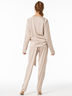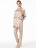 Костюм состоит из блузы прямого силуэта и классических свободных брюк. Крой обеспечивает изумительную посадку и скрывает неточности фигуры. Блузу рекомендуется носить заправленный на один бок , так чтобы был виден пояс бант, который, в прочем, можно завязать и по верх блузы. Красивый нежный цвет какао с молоком. Застежка брюк на молнию и кнопку.