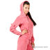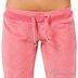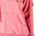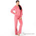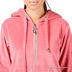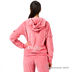 Мягкий домашний костюм из велюра брусничного цвета. Брюки с поясом-резинкой. Отверстия для шнурка на брюках и капюшоне отделаны металлическими вставками, велюровый шнурок украшен металлическими колокольчиками. Молния серебристого оттенка декорирована слайдером из металла в виде короны и имиджевых букв NC. Спина куртки в нижней части расшита паетками. На одном рукаве имеется неглубокий кармашек, который украшен круглой металлической вставкой. Все металлические детали декора инкрустированы стразами.