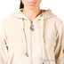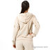 Мягкий домашний костюм из велюра цвета кофе с молоком. Брюки с поясом-резинкой. Отверстия для шнурка на брюках и капюшоне отделаны металлическими вставками, велюровый шнурок украшен металлическими колокольчиками. Молния серебристого оттенка декорирована слайдером из металла в виде короны и имиджевых букв NC. Спина куртки в нижней части расшита паетками. На одном рукаве имеется неглубокий кармашек, который украшен круглой металлической вставкой. Все металлические детали декора инкрустированы стразами.