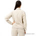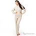 Мягкий велюровый костюм без капюшона бежевого оттенка. Карманы, манжеты и низ куртки, пояс брюк отделаны резинкой из хлопка. Передняя часть куртки декорирована узором из страз и двумя карманами. Высокая стойка горловины куртки выполнена из велюра и имеет атласные шнурки-затяжки с металлическими наконечниками, украшенными стилизованными буквами NC. Спина куртки декорирована вышивкой Nic Club.