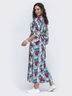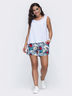 Летний комплект-тройка из мягкого штапеля: однотонный топ на завязках и шорты с эластичной резинкой на спинке. Завершает образ принтованная накидка с высокими разрезами по бокам. Тканевый пояс в комплекте.