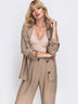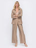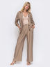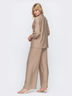 Стильный брючный комплект из жатой льняной ткани. Свободная рубашка с массивными пуговицами и нагрудным карманом. Модель со спущенными рукавами ¾ на шлёвках. Расклешенные брюки с завышенной талией и эластичной деталью на спинке. Застегиваются на молнию и пуговицу.