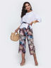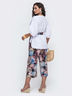 Летний брючный костюм. Укороченные брюки с эластичной деталью по талии. Блузка свободного кроя с удлиненной спинкой. Пояс из основной ткани пришит на спинке.